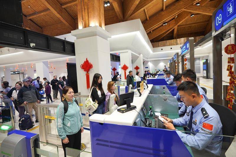 三亚凤凰出入境边防检查站执勤民警为通关旅客快速办理边检手续。蒙绪顺摄